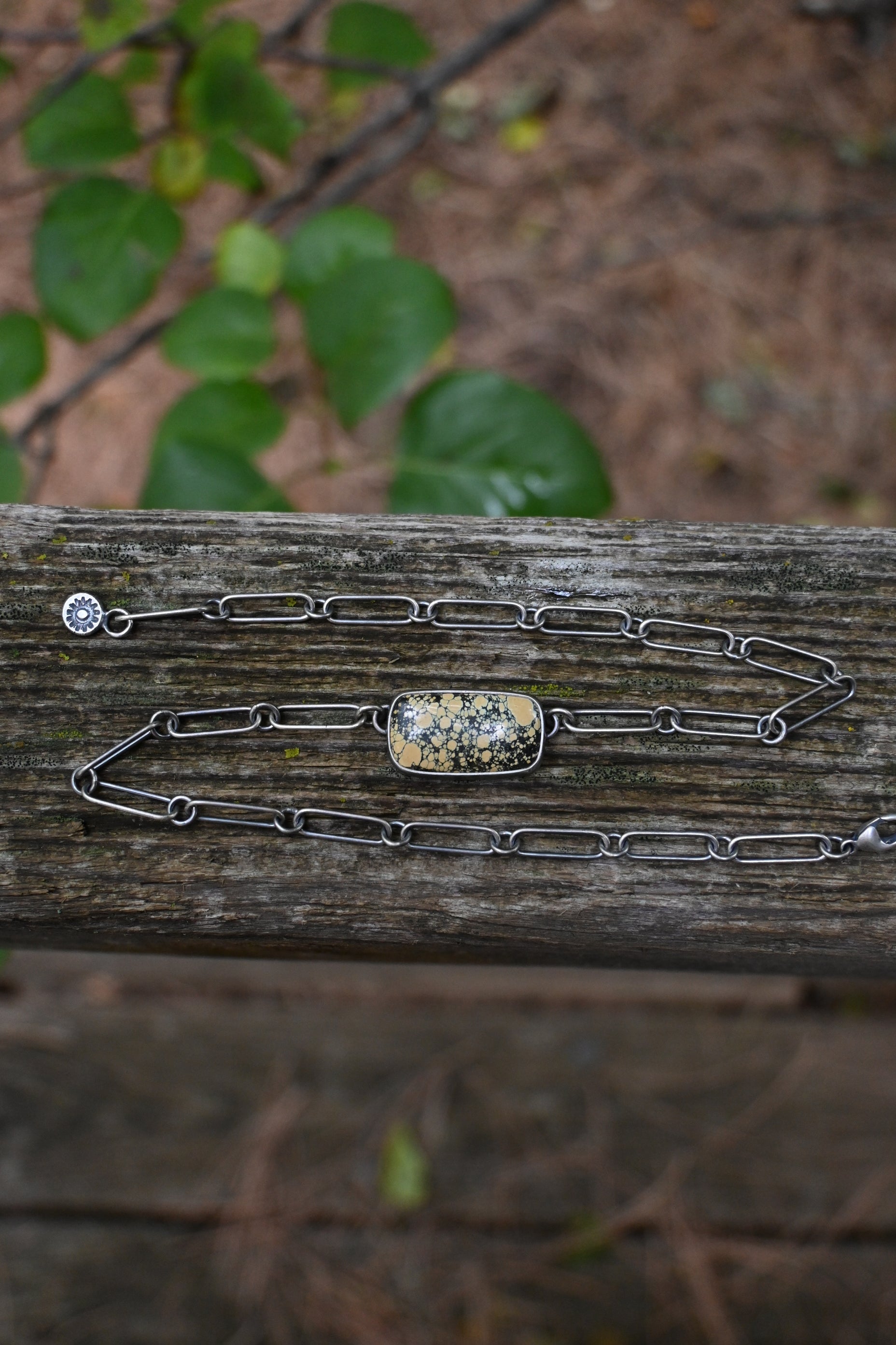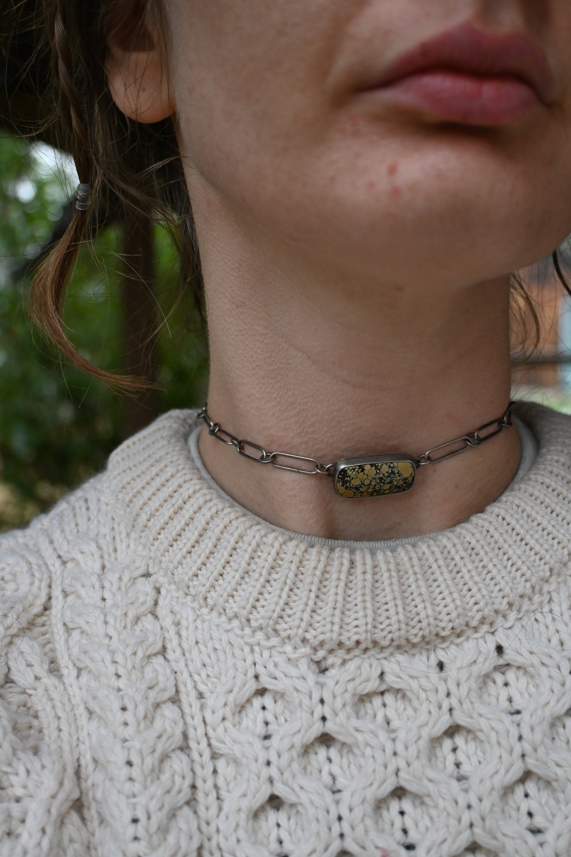 This choker features a beautiful high grade rectangular New Lander Variscite centered on a handmade long + short link chain. Each link was formed slowly by hand and soldered together to create a strong + unique chain. Adjustable up to 16 inches. Dipped in patina and buffed for a matte finish. Handmade slowly, and one of a kind.