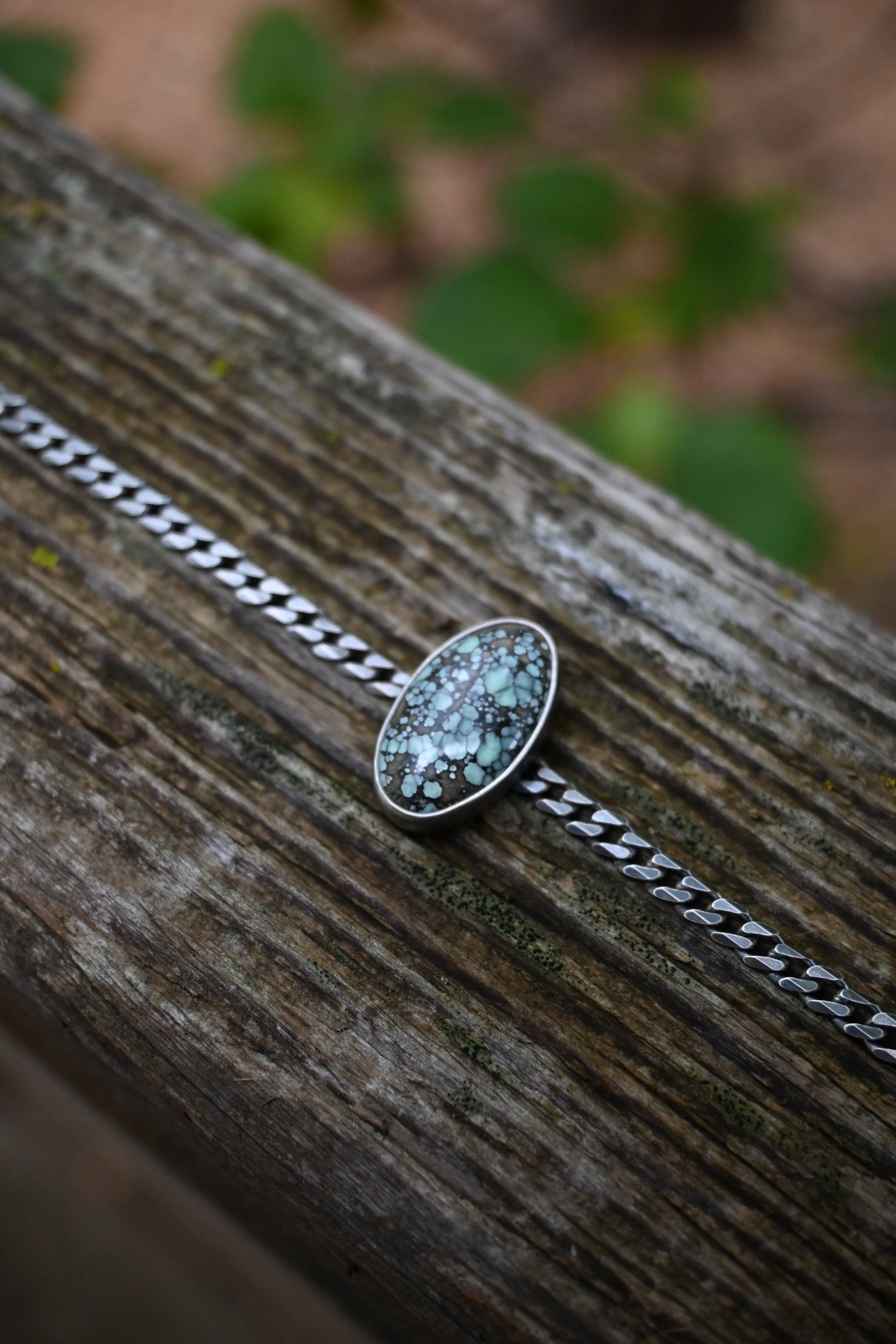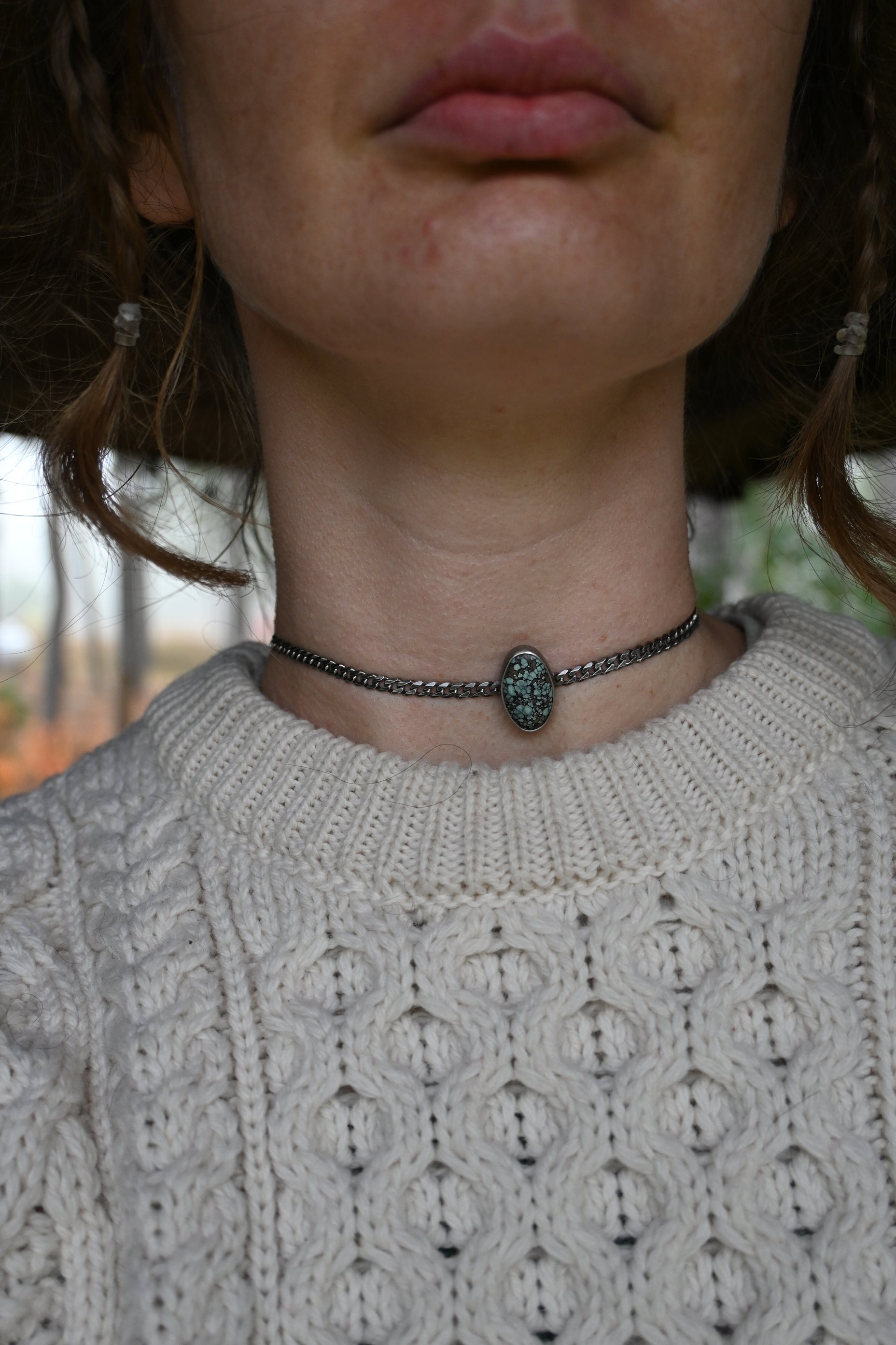 This choker is made with a medium gauge 4mm flat curb chain and a beautiful Star Fox Variscite stone at its center. Dipped in patina and buffed for a dark, matte finish. Chain is adjustable from 14-16". Note that due to the stone's orientation, this choker is meant to wear snug against the neck and will not sit well as a loose necklace.