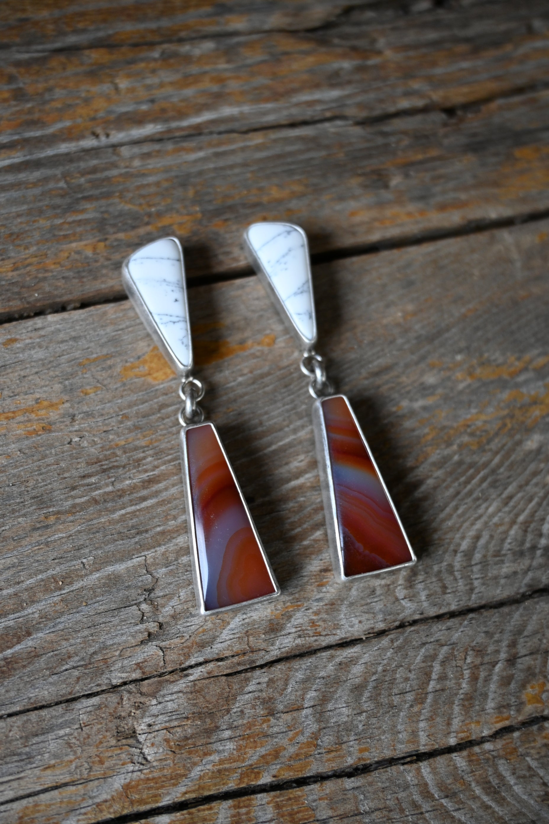 These earrings feature a simple setting of sterling silver and gorgeous stones -- white buffalo and banded agate. On a stud setting, each weighs 9 grams and measures 2.25 inches long. Dipped in patina and buffed for a matte finish.