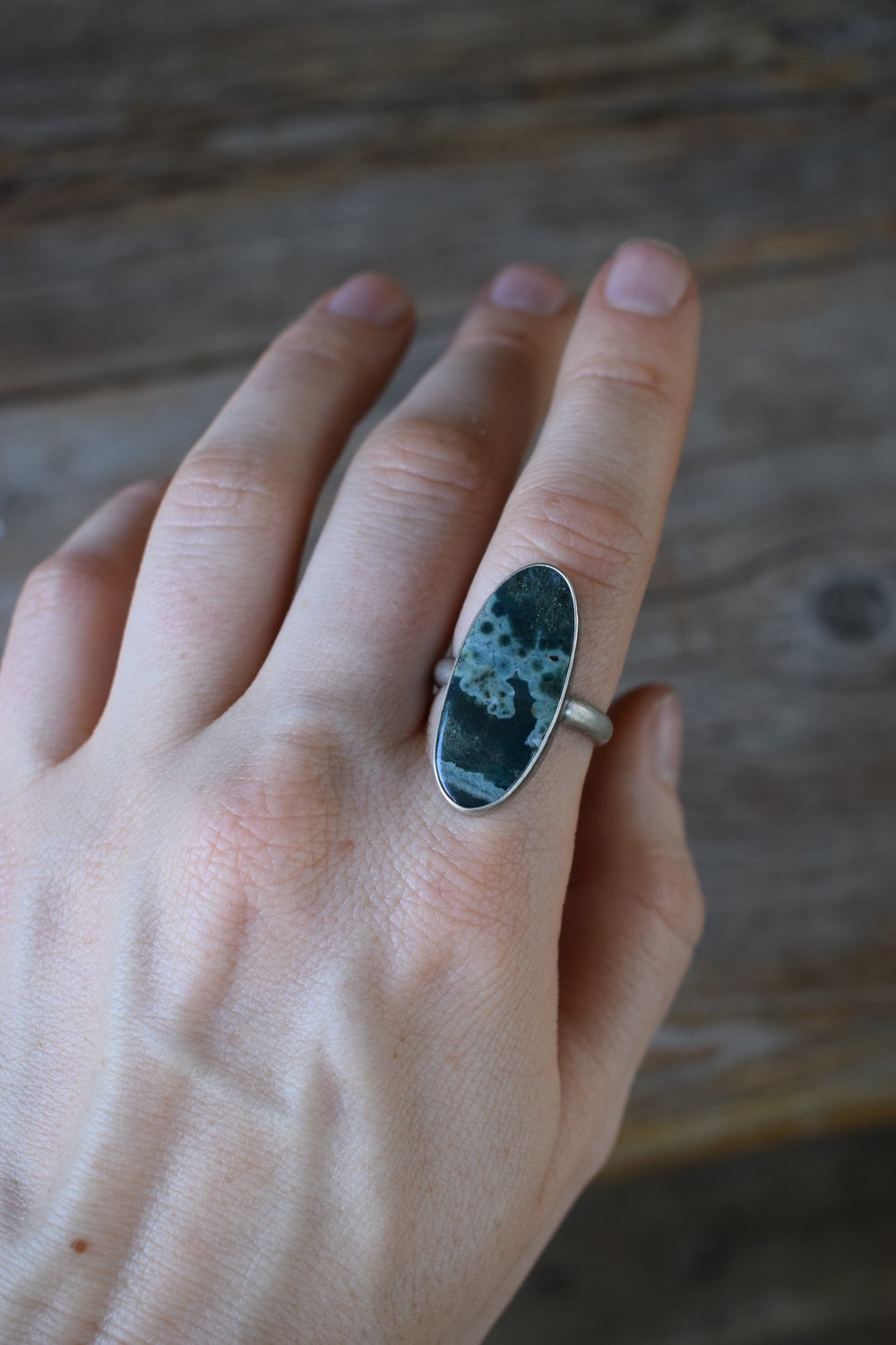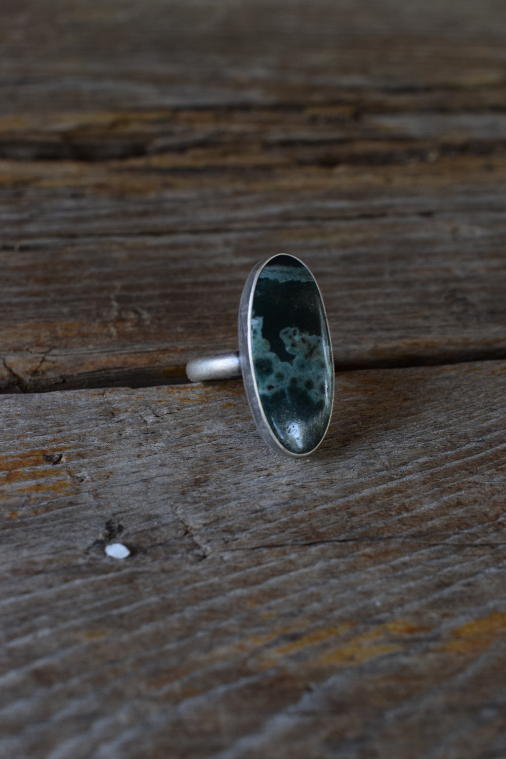 A simple setting to a beautiful green Ocean Jasper. Set in sterling silver, with a single wide band. Size 7. Dipped in patina and buffed to a matte finish.