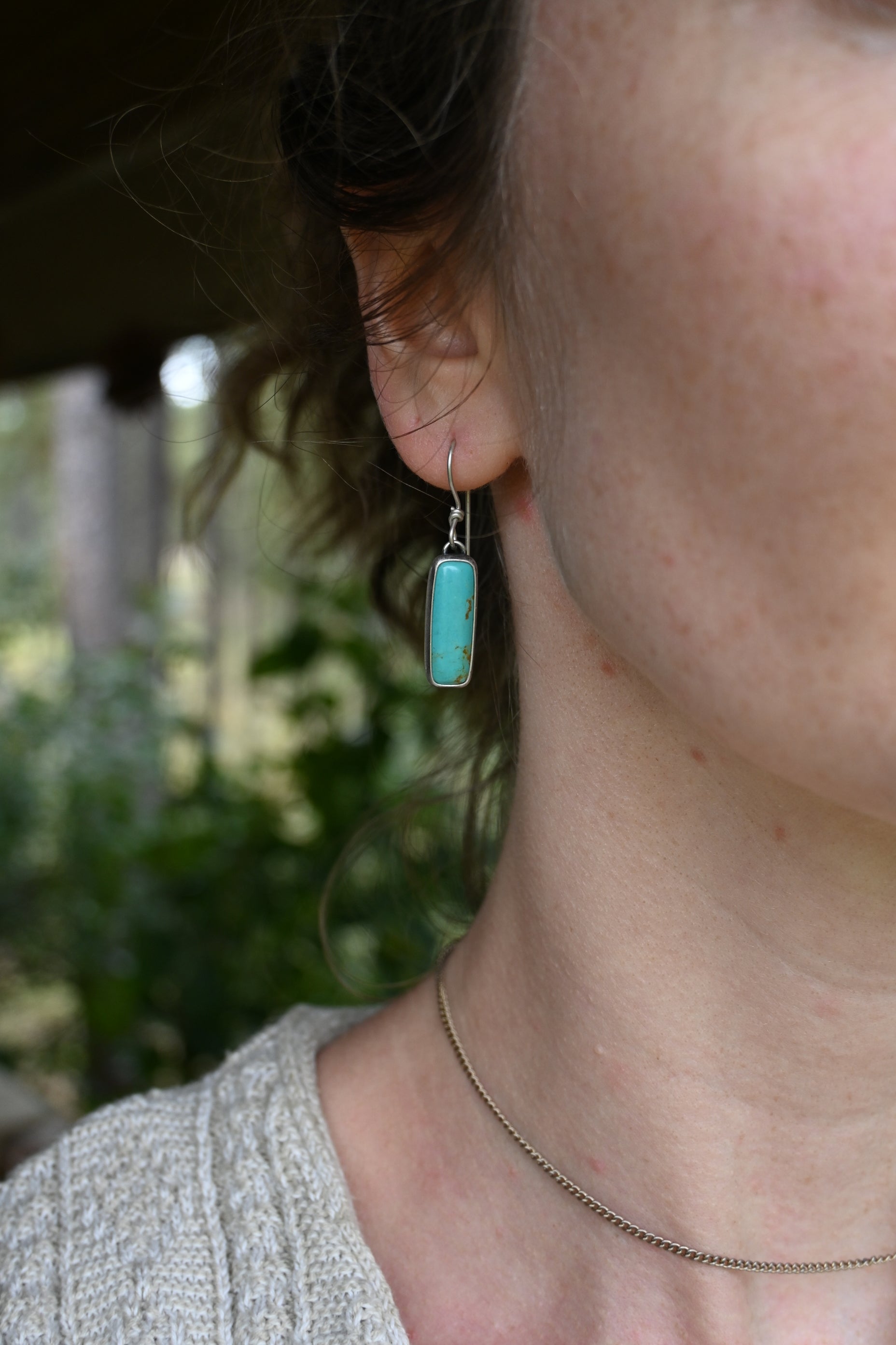 These earrings feature a simple setting of sterling silver and gorgeous Tyrone turquoise stones. Simple and great for every day. Each weighs 3 grams and measures just over 1.5 inches from the top of the ear wire. Dipped in patina and buffed for a matte finish.