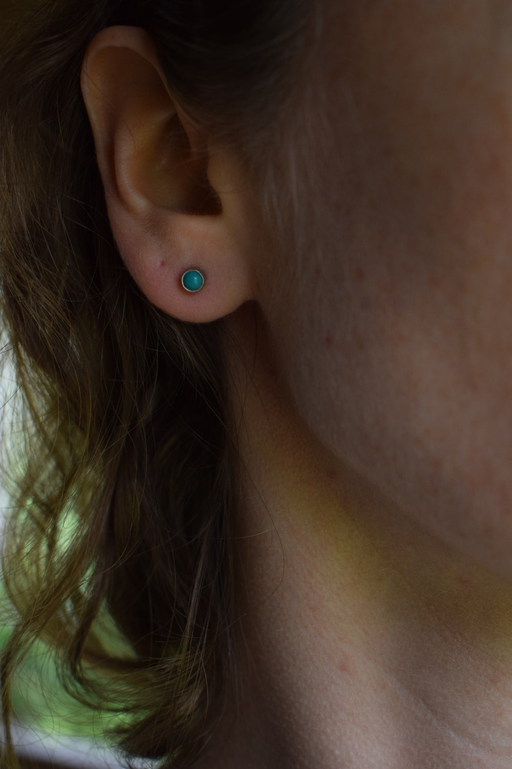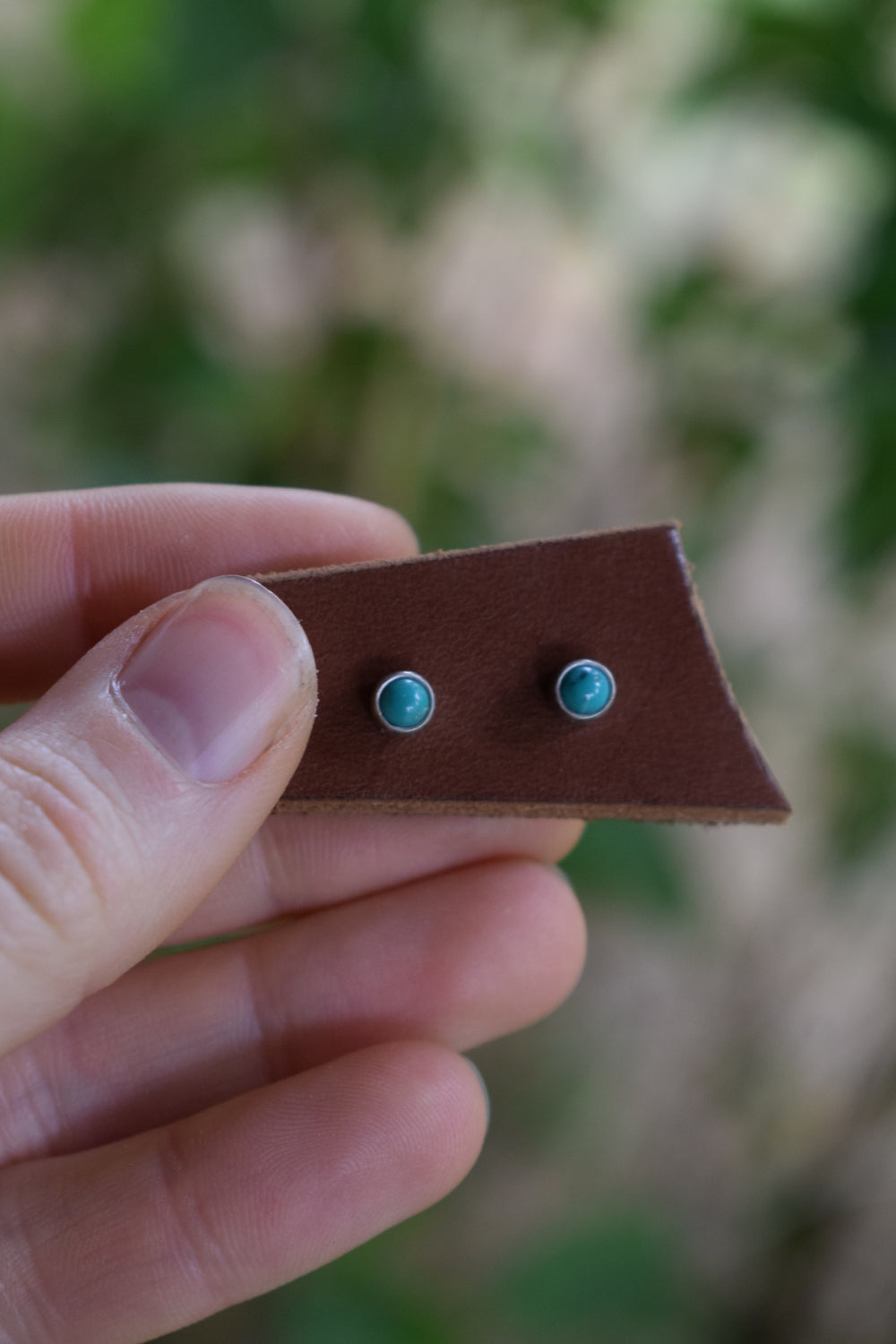Round Mexican turquoise stones set in sterling silver. Dipped in patina and buffed for a matte finish.