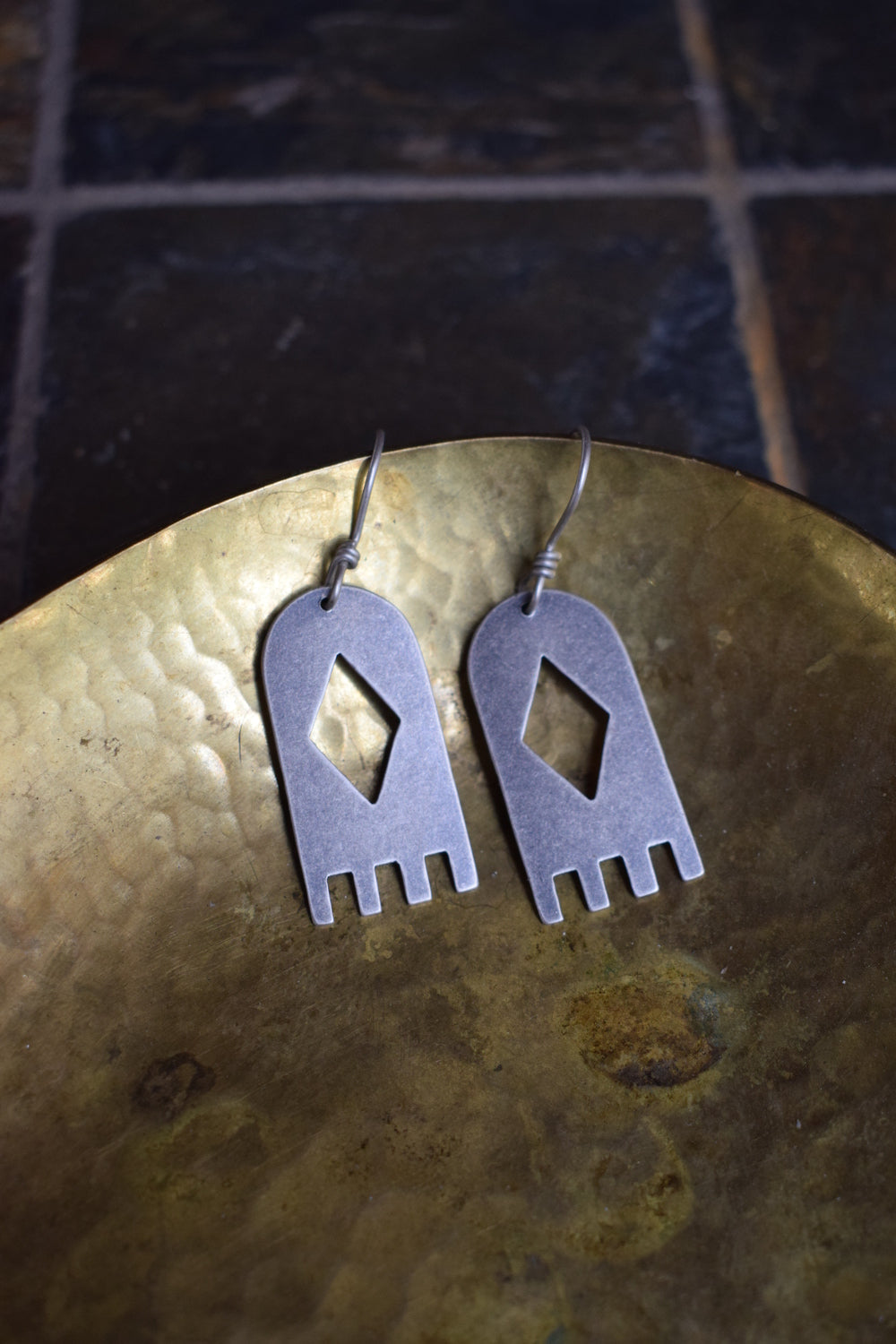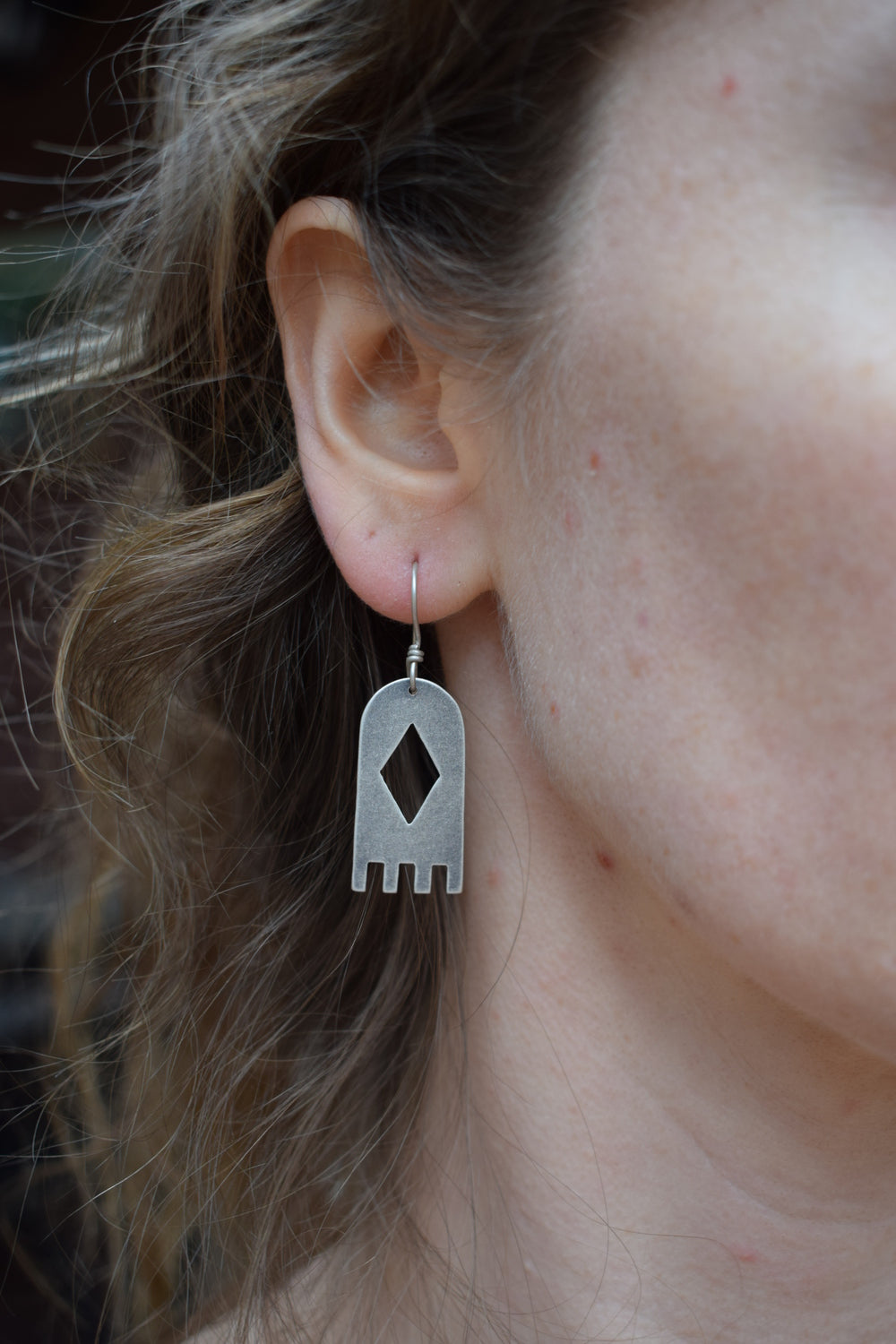Made to Order - Please allow 2-4 weeks for shipment. Crafted with sterling silver, these simple arched earrings feature triangular and rectangular cutouts. Perfect for everyday wear. Dipped in patina and buffed for a matte finish.