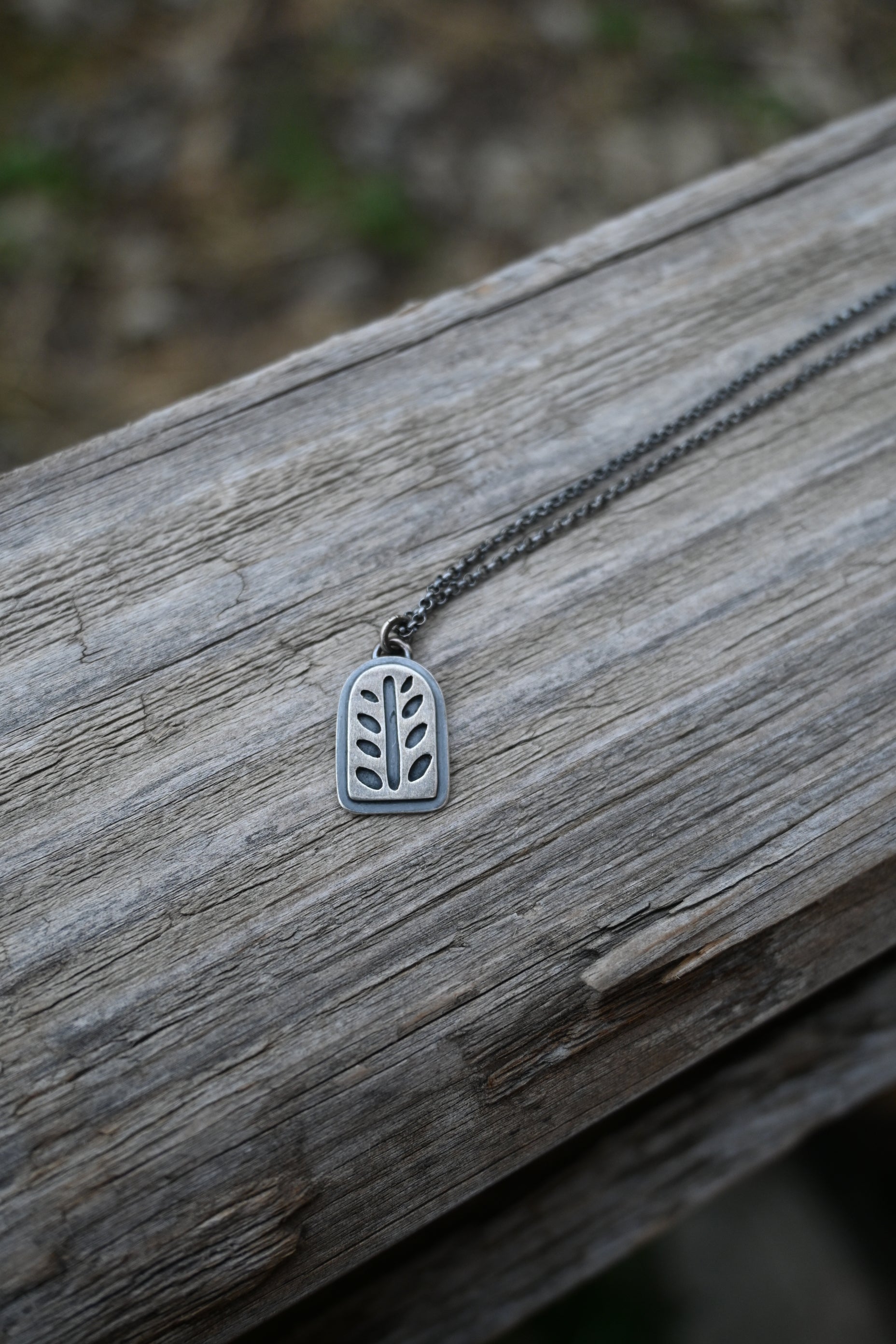 Made with sterling silver, this necklace features a small double layered, hand drawn and sawn wheat design on an 18 inch chain. Dipped in patina and buffed for a matte finish.