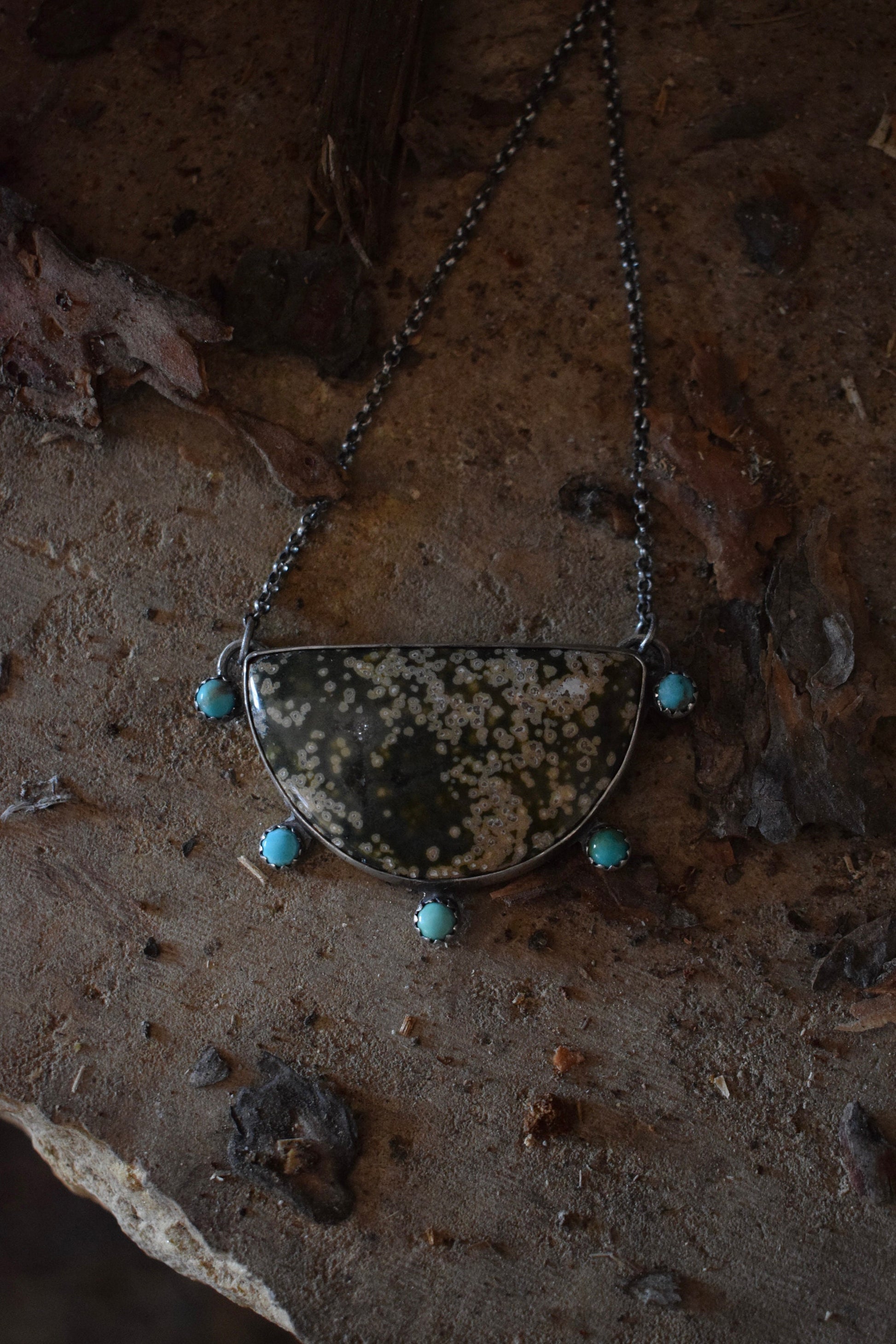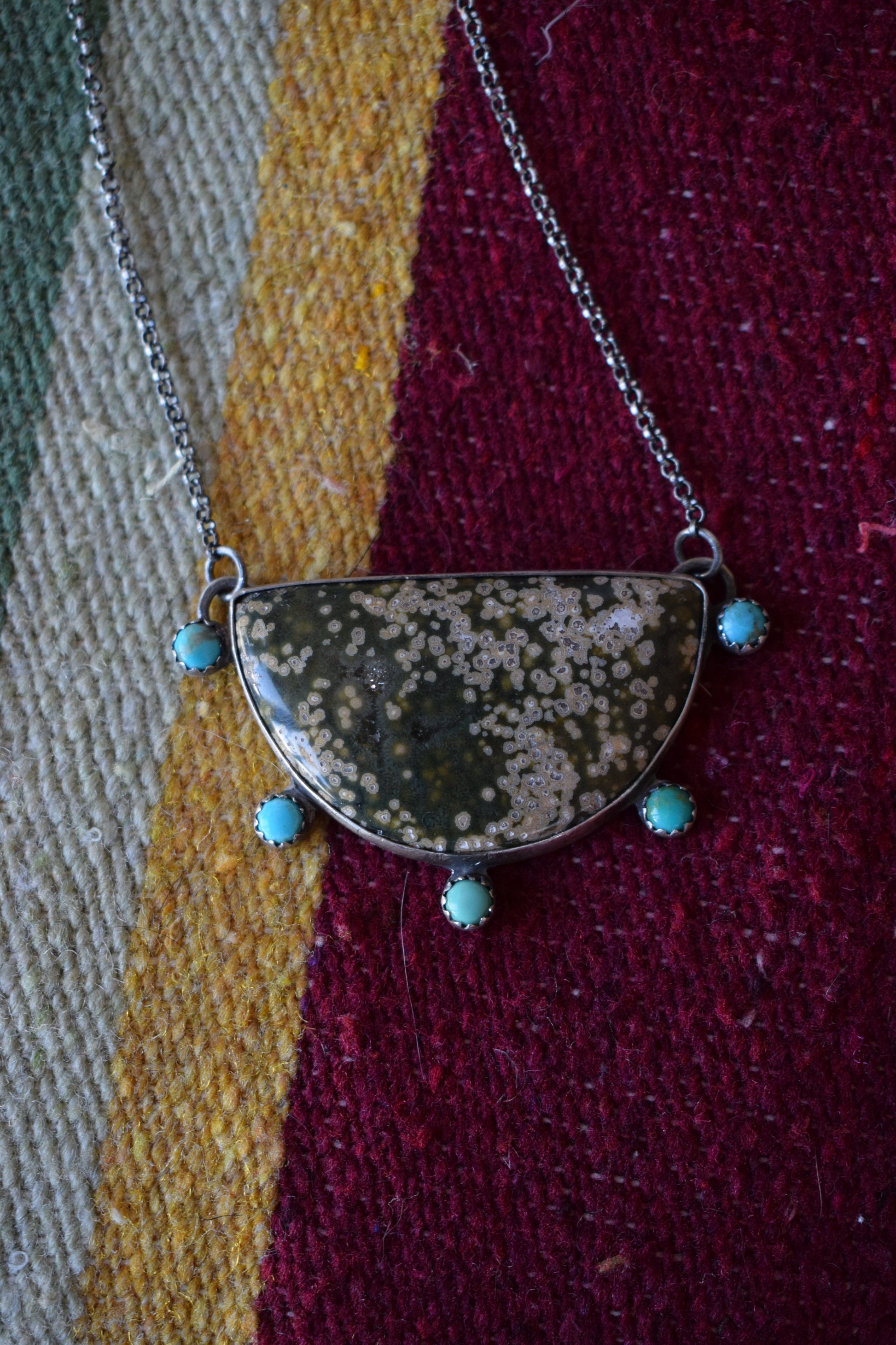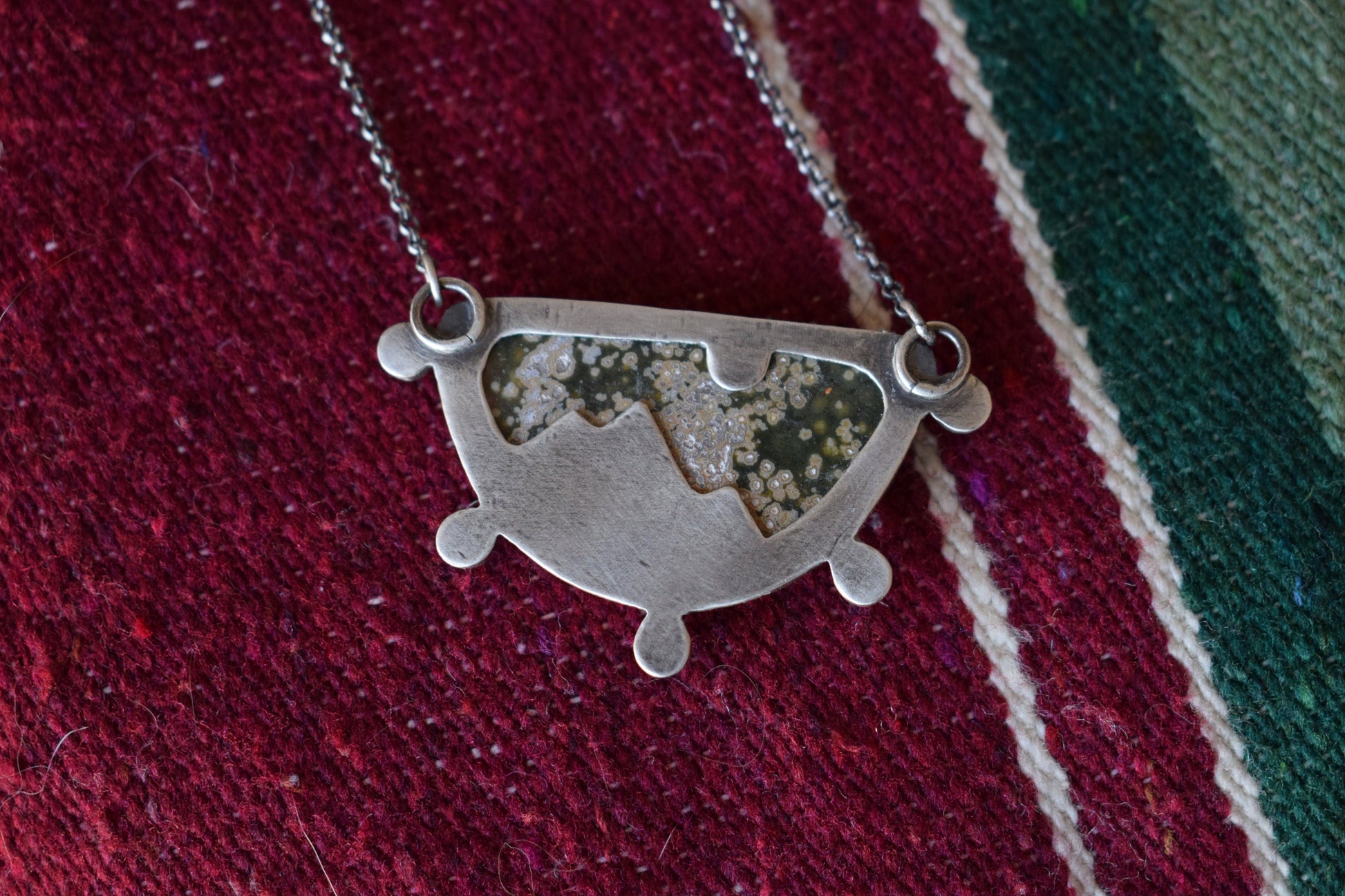 This gorgeous green ocean jasper is accented by five small cloud mountain turquoise pieces. It is made for the water, for the mountains, for the places where water earth and sky collide. The cutout backing shows the mountains and the sun, to bring you closer to them. Sterling silver is lightly patina'd for detail and sits on an 18 inch chain. ECS makers mark is stamped on a small silver tag by the chain clasp. Handmade slowly, and one of a kind.